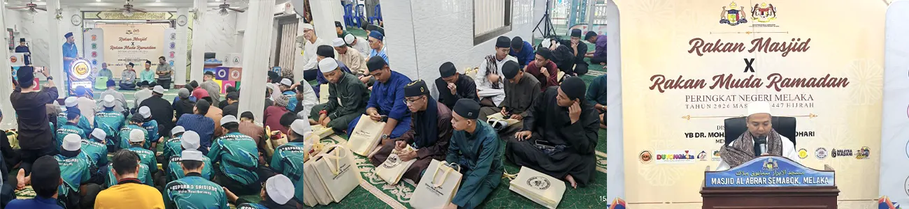 15 Mac 2026 - Suasana penuh kemeriahan di Masjid Al-Abrar, Semabok Melaka apabila para huffaz ADTEC JTM Kampus Selandar selaku peserta khatam Al-Quran telah mengimarahkan masjid bagi menjayakan Program Rakan Masjid X Rakan Muda Ramadan Peringkat Negeri Melaka 2026.