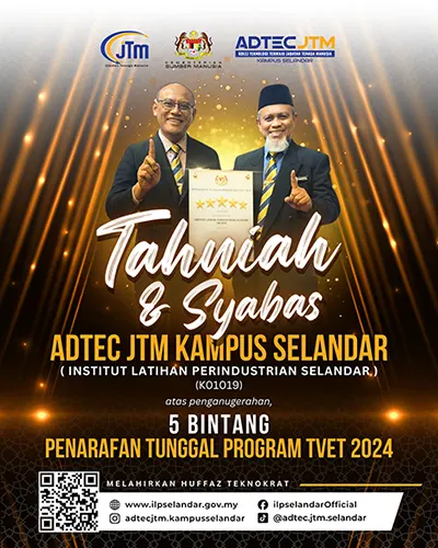 Sekitar momen bermakna di Majlis Anugerah Institusi TVET 5 Bintang yang diraikan dengan penuh gemilang. Setinggi-tinggi penghargaan atas pengiktirafan ini kepada ADTEC JTM Kampus Selandar (Institut Latihan Perindustrian (ILP) Selandar, sebagai bukti komitmen berterusan warga kerja dalam memperkasa kualiti latihan TVET.