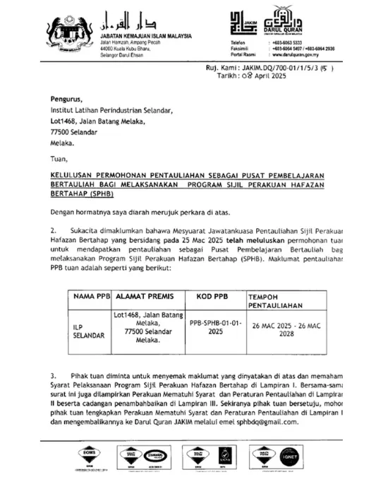 Kualiti program tahfiz kami dijamin melalui Kelulusan Pentauliahan daripada Darul Quran JAKIM. Sebagai pusat bertauliah untuk Program Sijil Hafazan Bertahap (SPHB) bermula Mac 2025 hingga Mac 2028, kami memastikan setiap pelajar dibimbing mengikut sukatan rasmi yang melayakkan mereka menerima pensijilan yang sah dan diiktiraf.