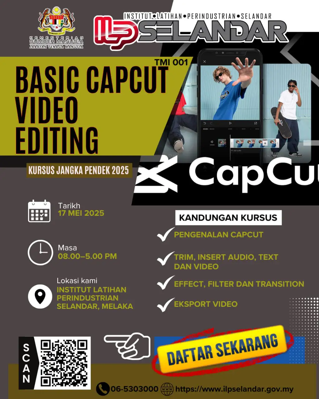 Adakah anda ingin menguasai editing video menggunakan CAPCUT? Jangan lepaskan peluang untuk menyertai 𝗞𝘂𝗿𝘀𝘂𝘀 𝗝𝗮𝗻𝗴𝗸𝗮 𝗣𝗲𝗻𝗱𝗲𝗸 𝟮𝟬𝟮𝟱 yang dianjurkan oleh Institut Latihan Perindustrian (ILP) Selandar!