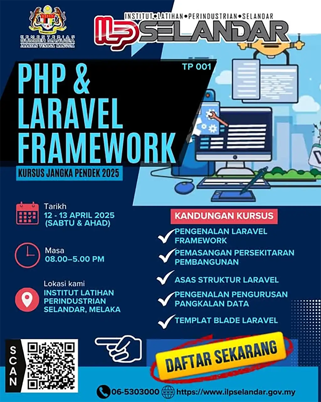 Adakah anda ingin menguasai pembangunan aplikasi web dengan Laravel, salah satu framework PHP yang paling popular? Jangan lepaskan peluang untuk menyertai 𝗞𝘂𝗿𝘀𝘂𝘀 𝗝𝗮𝗻𝗴𝗸𝗮 𝗣𝗲𝗻𝗱𝗲𝗸 𝟮𝟬𝟮𝟱 yang dianjurkan oleh Institut Latihan Perindustrian (ILP) Selandar!