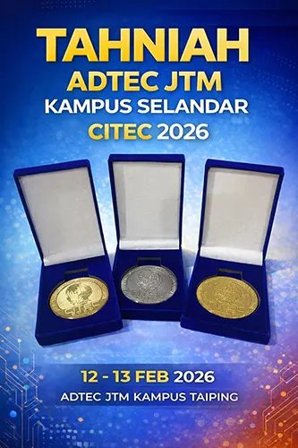 Sebagai sebahagian daripada misi "Melahirkan Huffaz Teknokrat", ADTEC JTM Kampus Selandar sekali lagi mengharumkan nama atas kecemerlangan di 𝗣𝗲𝗿𝘁𝗮𝗻𝗱𝗶𝗻𝗴𝗮𝗻 𝗞𝗿𝗲𝗮𝘁𝗶𝘃𝗶𝘁𝗶 & 𝗜𝗻𝗼𝘃𝗮𝘀𝗶 (𝗖𝗜𝗧𝗘𝗖) 𝟮𝟬𝟮𝟲 yang berlangsung di ADTEC JTM Kampus Taiping.